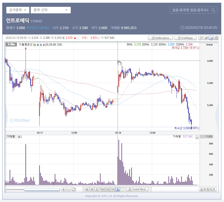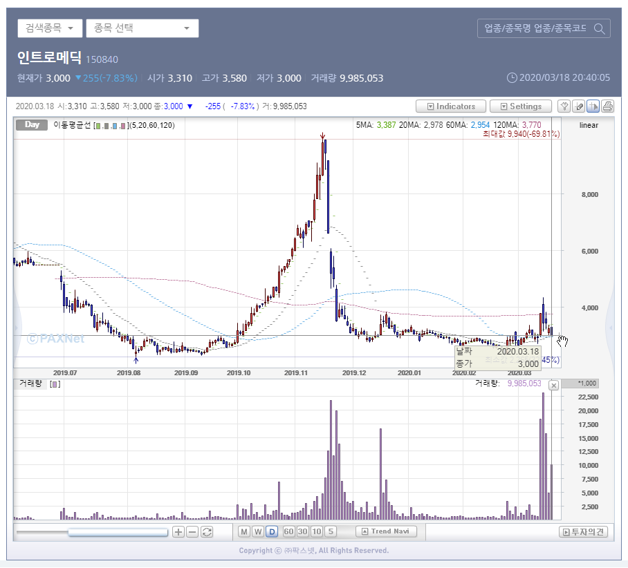 코로나 진단키트 총판 계약건으로 상한가(2020.03.18)를 기록한 이후 20일선까지 주가가 후퇴한 모양새다.